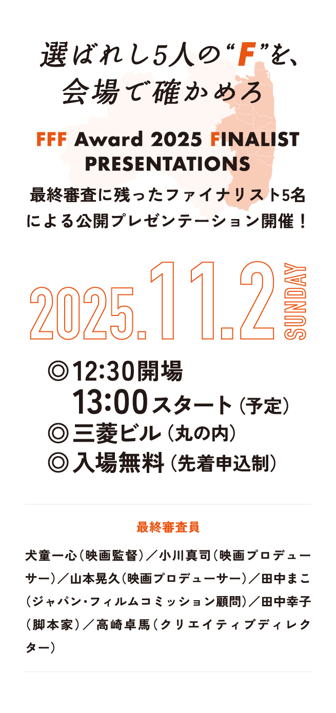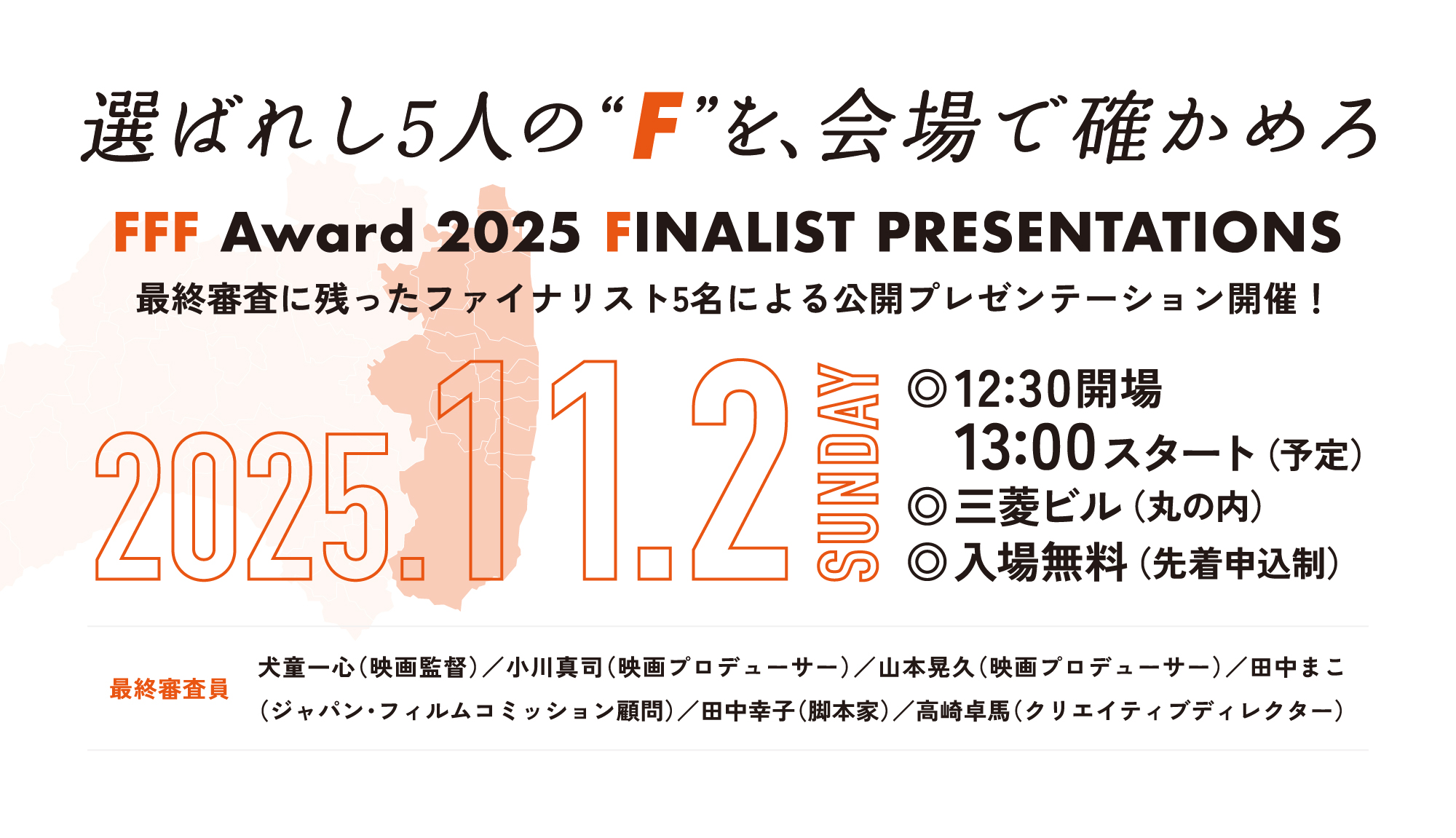 福島県浜通り。いま、映画づくりの新しい可能性が広がり、映画制作関係者たちからも熱い注目を集めているこの地域で、映画企画を広く募集する『FFF Award 2025』が開催されます。FFF ― Fukushima Film Frontier。最後の “F” は、Fantasyでも、Fictionでも、Futureでもかまいません。あなたの感性で、その “F” に新たな意味を込めてください。その想いをFilmに乗せて、福島から、映画のFrontierをひらく。「浜通りを撮ってみろ。福島でAwardを獲ってみろ。」あなたの物語が、きっと世界へとつながる一歩になるはずです。